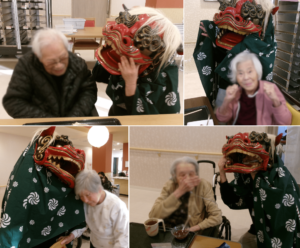 新年あけましておめでとうございます。 本年も入居者様に安心と笑顔をお届けできるよう、職員一同努めてまいります。どうぞよろしくお願いいたします。 先日、獅子舞のイベントを開催しました。 赤い獅子が登場すると、入居者様からは