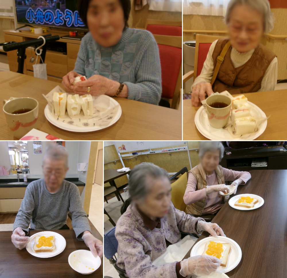 完成したフルーツサンドを前に、「美味しいね」と笑顔が広がり、楽しいひとときとなりました。今後も皆さまに喜んでいただけるレクリエーションを企画してまいります。